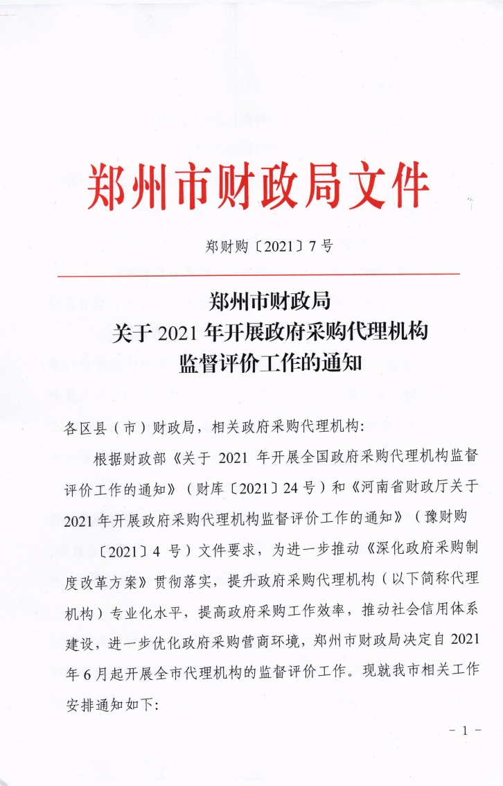 鄭州市財(cái)政局 關(guān)于2021年開展政府采購代理機(jī)構(gòu)監(jiān)督評價工作的通知