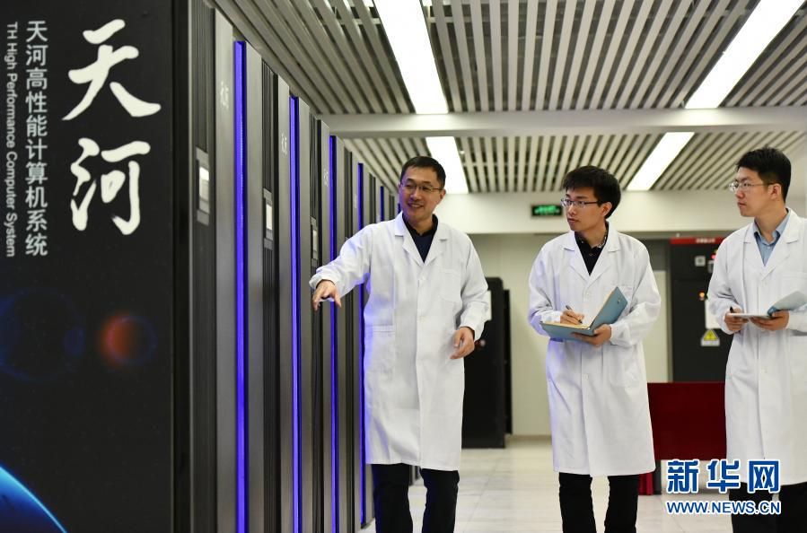 在國(guó)家超級(jí)計(jì)算天津中心“天河三號(hào)”原型機(jī)機(jī)房?jī)?nèi),應(yīng)用研發(fā)部部長(zhǎng)孟祥飛(左)和同事一起巡查(2019年4月24日攝)。新華社記者 李然 攝