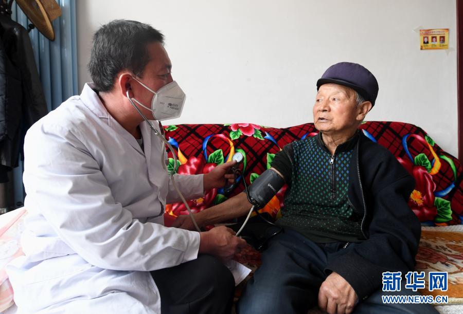 河北阜平縣龍泉關(guān)鎮(zhèn)顧家臺(tái)村村醫(yī)為村民測(cè)量血壓(4月15日攝)。新華社記者 王曉 攝