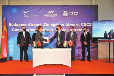圖為河南機(jī)場集團(tuán)、布達(dá)佩斯機(jī)場在布達(dá)佩斯簽訂戰(zhàn)略合作協(xié)議。受訪單位供圖