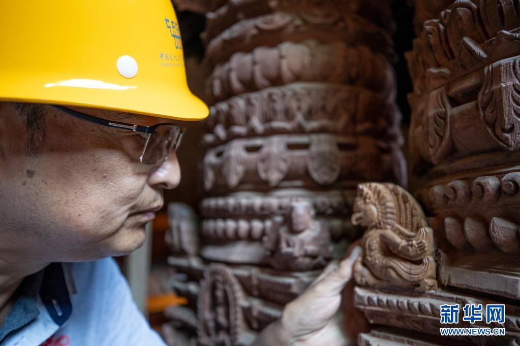 2019年10月10日,在尼泊爾加德滿都杜巴廣場,中國派出的文物修復(fù)隊(duì)技術(shù)主管周建國在九層神廟修復(fù)現(xiàn)場查看一個(gè)修復(fù)好的文物。新華社記者 王婧嬙 攝