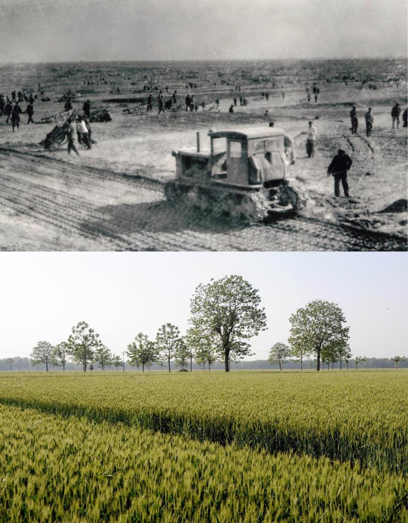 拼版照片:上圖為20世紀(jì)60年代河南省蘭考縣改造鹽堿地的情形(資料照片);下圖為蘭考縣堌陽鎮(zhèn)的一片麥田(2014年5月5日新華社記者朱祥攝)。新華社發(fā)