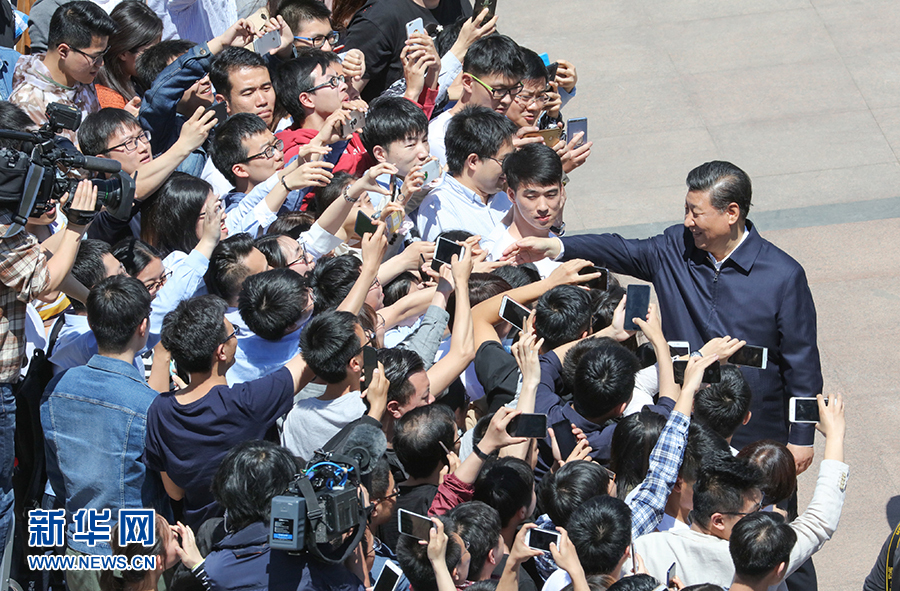 2018年5月2日,中共中央總書記、國家主席、中央軍委主席習(xí)近平來到北京大學(xué)考察。這是習(xí)近平離開學(xué)校時(shí)同道路兩旁師生親切握手。新華社記者王曄攝