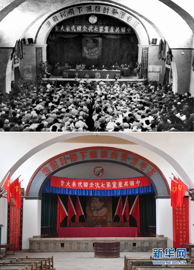 拼版照片:上圖為中國共產黨第七次全國代表大會會場(資料照片,新華社發(fā));下圖為2021年3月31日拍攝的位于延安市楊家?guī)X革命舊址的中國共產黨第七次全國代表大會會場(新華社記者張博文攝)。新華社發(fā)