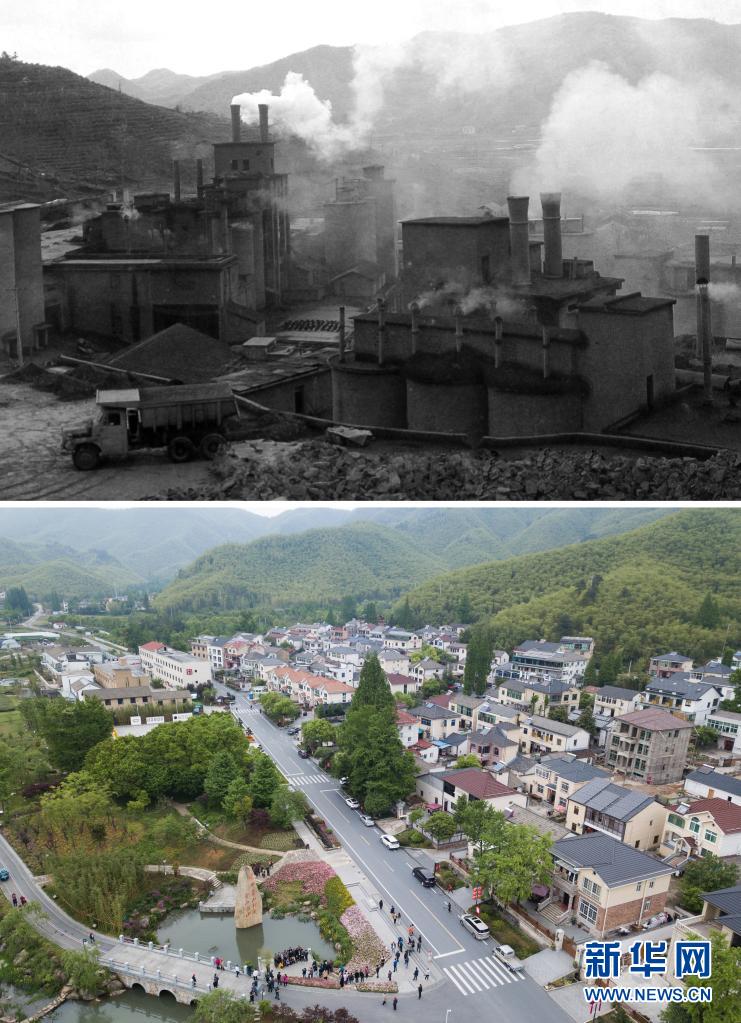 拼版照片:上圖為浙江省湖州市安吉縣天荒坪鎮(zhèn)余村上世紀八十年代的資料照片;下圖為2018年4月24日,游客在整修一新的余村游覽拍照(新華社記者翁忻旸攝)。新華社發(fā)