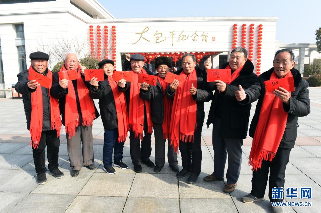 2月3日,在安徽省滁州市鳳陽縣小崗村,8位“大包干”帶頭人在大包干紀念館前展示自家領取的集體經濟收益股權分紅。新華社記者 周牧 攝