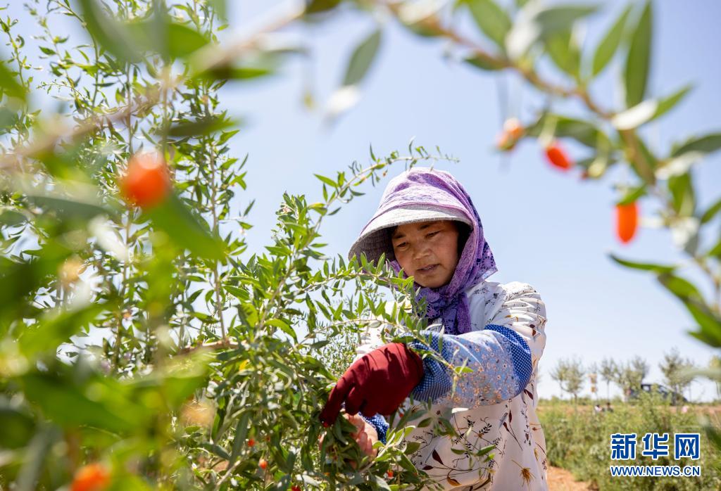 7月1日,采摘工在寧夏中寧縣璽贊生態(tài)枸杞莊園采摘枸杞。新華社記者 楊植森 攝