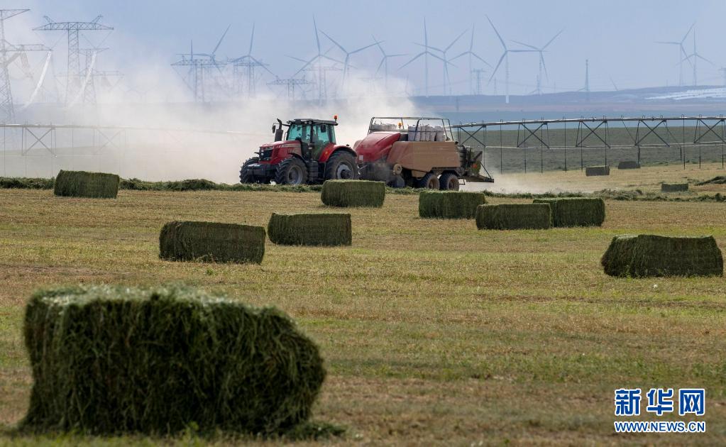 在寧夏鹽池縣馮記溝鄉(xiāng)平臺村的優(yōu)質(zhì)牧草基地,農(nóng)戶用機械將牧草打捆(7月14日攝)。新華社記者 楊植森 攝