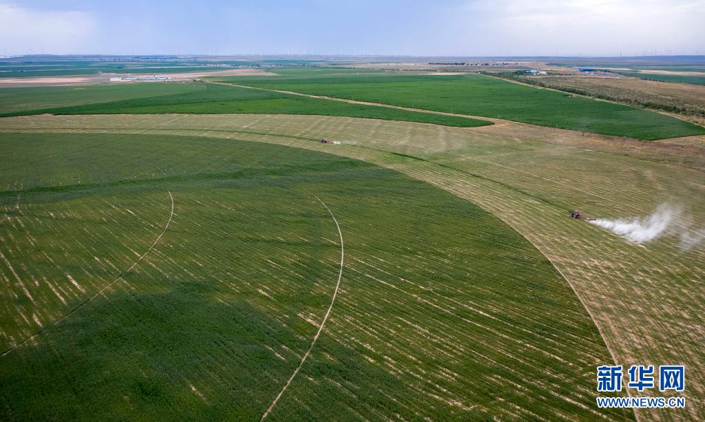在寧夏鹽池縣馮記溝鄉(xiāng)平臺村的優(yōu)質(zhì)牧草基地,農(nóng)戶用機械收割牧草(無人機照片,7月14日攝)。新華社記者 楊植森 攝