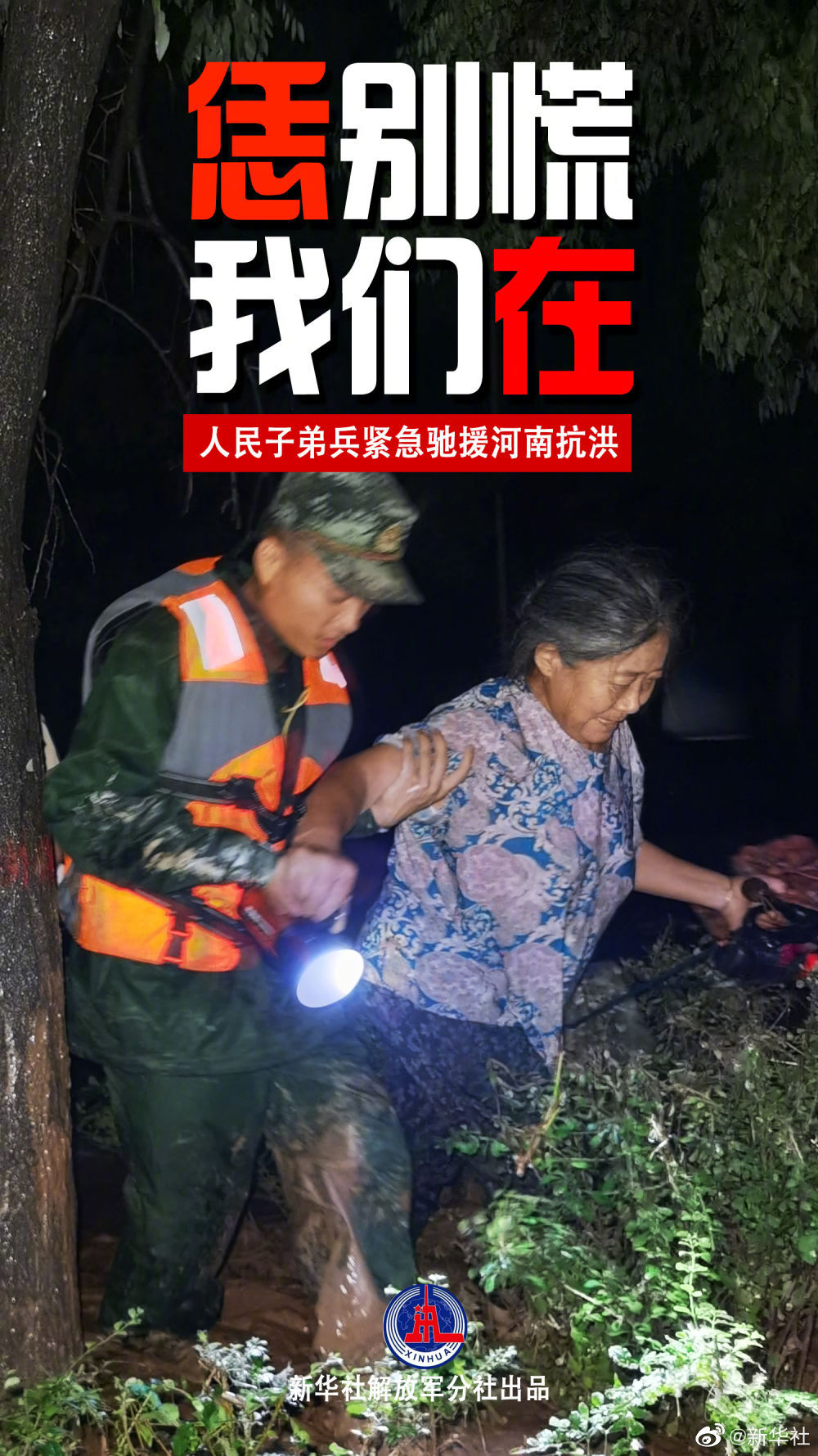 7月21日凌晨,武警第一機動總隊某支隊官兵在河南鞏義米河鎮(zhèn)轉(zhuǎn)移受困群眾(手機拍攝)。新華社發(fā)(江澤紅 攝)
