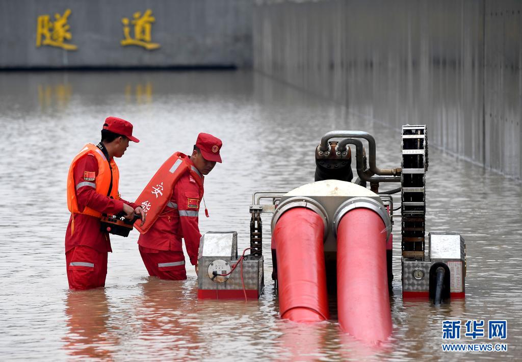 7月22日,來(lái)自江西的救援人員在鄭州市京廣南路隧道進(jìn)行排澇作業(yè)。新華社記者 李安 攝