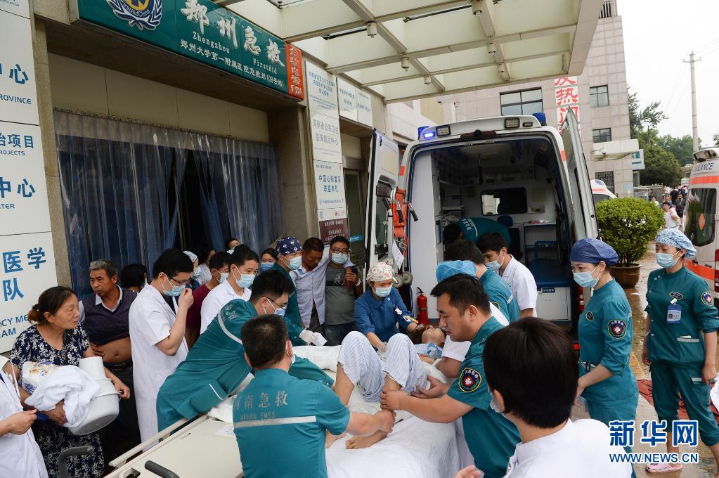 7月21日,鄭州大學(xué)第一附屬醫(yī)院河醫(yī)院區(qū)醫(yī)護(hù)人員幫助患者轉(zhuǎn)院。新華社記者 趙鵬 攝