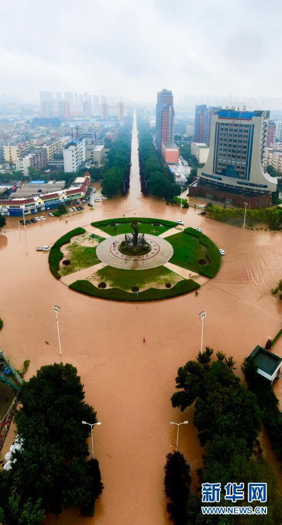 7月22日,河南安陽(yáng)開發(fā)區(qū)七仙女環(huán)島被淹沒(méi)(無(wú)人機(jī)拍攝)。新華社發(fā)(馬丁 攝)
