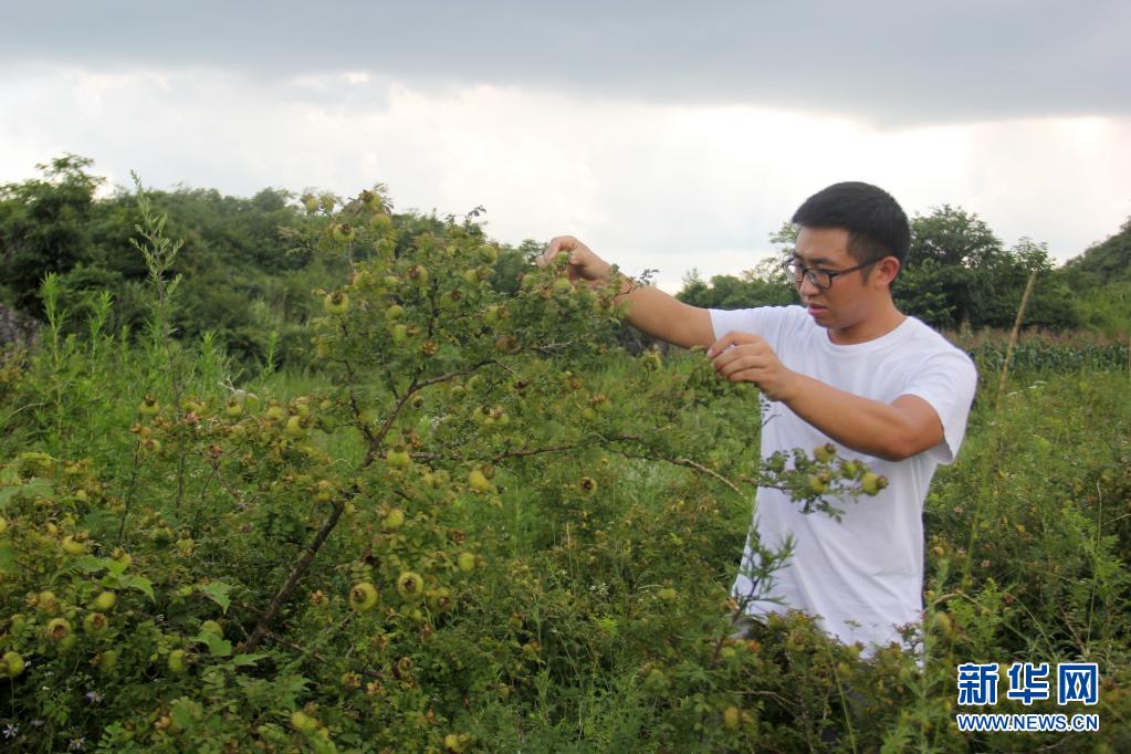 7月26日,在貴州省六枝特區(qū)新窯鎮(zhèn)播雨村,楊崗在查看刺梨的生長(zhǎng)情況。新華社記者 潘德鑫 攝