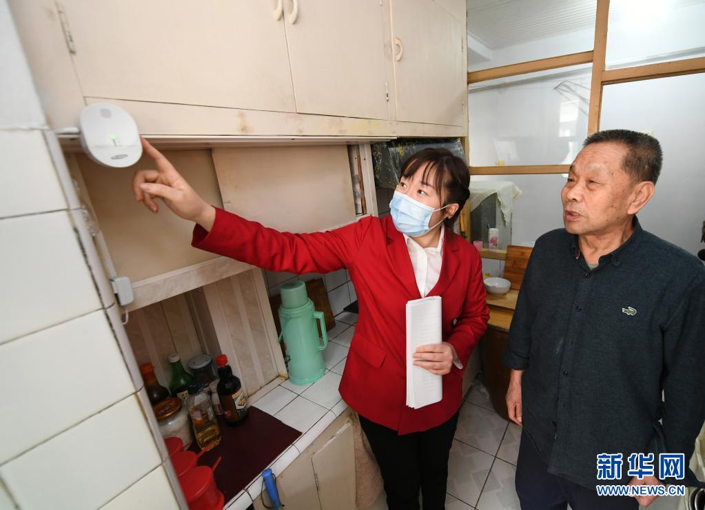 吉林省長(zhǎng)春市長(zhǎng)山花園社區(qū)黨委書記韓麗萍(左)到獨(dú)居老人家中檢查燃?xì)鈭?bào)警設(shè)備(資料照片)。新華社發(fā)