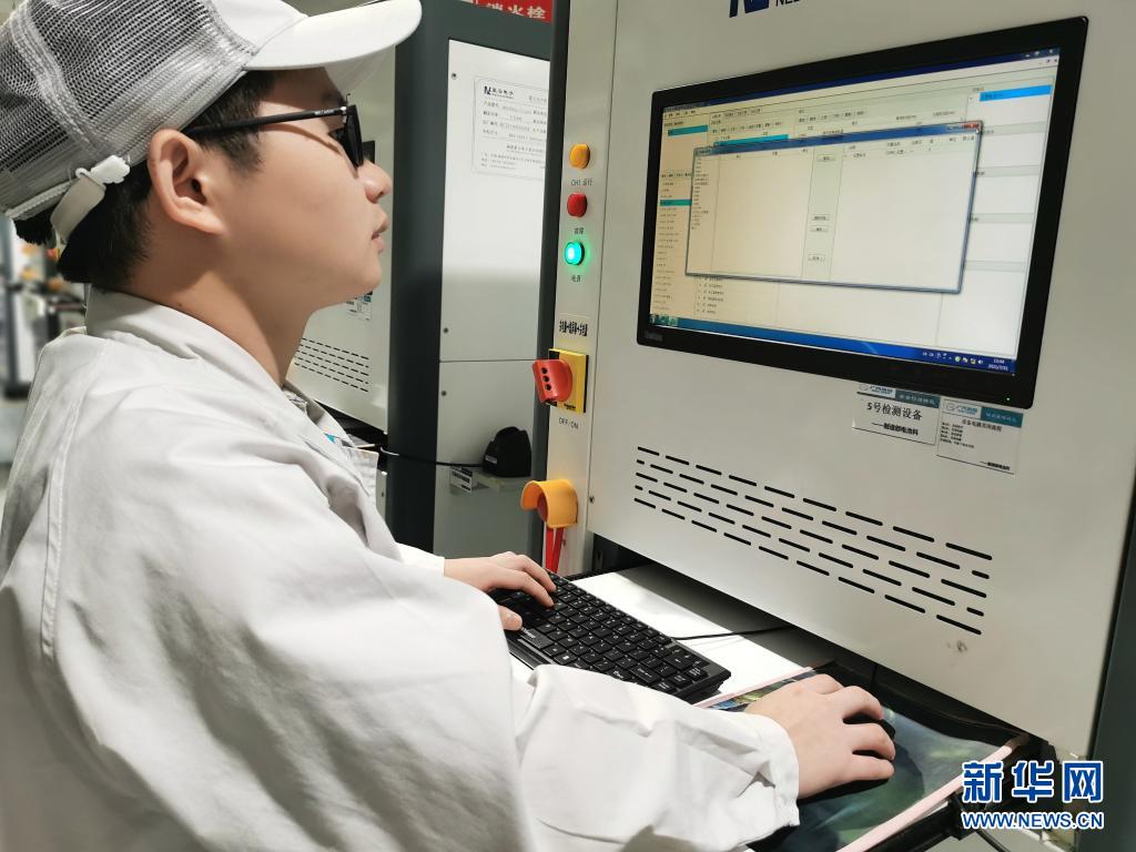 7月20日,在廣州廣汽埃安新能源汽車有限公司動(dòng)力電池車間,電池支持工程師周林在調(diào)試動(dòng)力電池檢測(cè)設(shè)備。新華社發(fā)