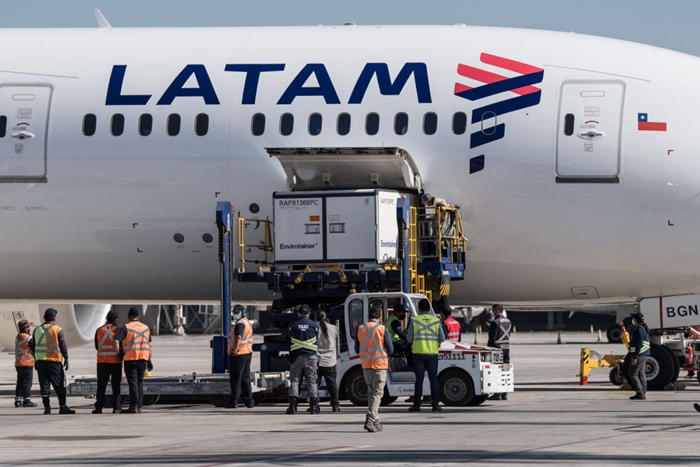當(dāng)?shù)貢r(shí)間1月28日上午,首批近200萬(wàn)劑由中國(guó)科興公司生產(chǎn)的新冠疫苗運(yùn)抵智利首都圣地亞哥。新華社發(fā)(豪爾赫·比列加斯攝)