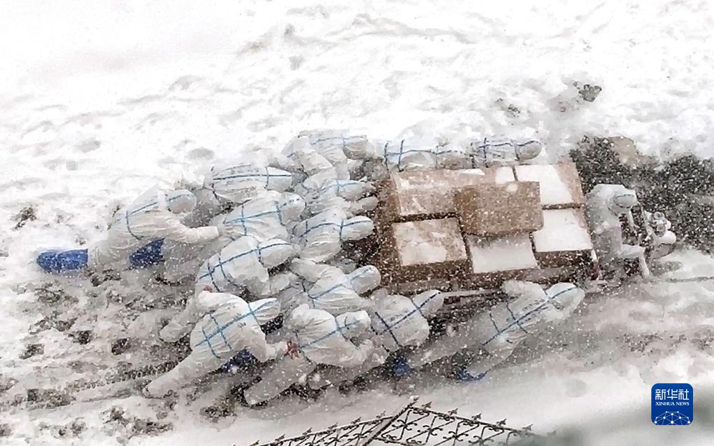 大連海洋大學(xué)的志愿者推著滿載的三輪車上坡,將物資送到學(xué)生宿舍(2021年1月6日攝)。新華社發(fā)(大連海洋大學(xué)供圖)