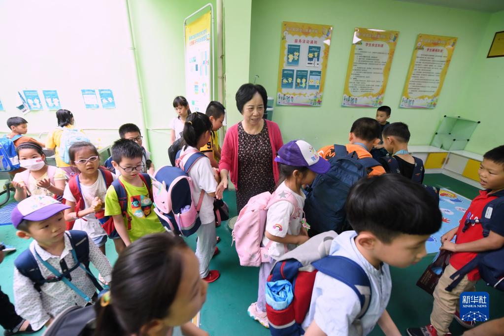 福建省福州市鼓樓區(qū)東街街道軍門社區(qū)黨委書記林丹來到軍門社區(qū)“陽光朵朵”少兒托管中心看望放學(xué)后在這里托管的小朋友(6月23日攝)。新華社記者 林善傳 攝