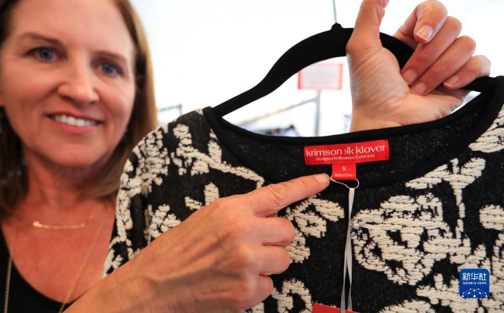 2019年9月12日,在美國(guó)科羅拉多州博爾德,克里姆森-克洛弗公司創(chuàng)始人兼首席執(zhí)行官朗達(dá)·斯溫森展示中國(guó)制造的衣服的標(biāo)簽。新華社記者 李穎 攝