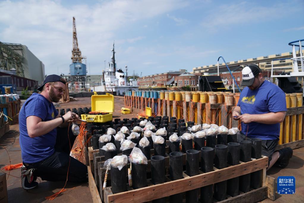 2019年5月25日,工作人員在美國(guó)賓夕法尼亞州費(fèi)城一處碼頭安裝產(chǎn)自中國(guó)湖南瀏陽(yáng)的煙花,為當(dāng)晚美國(guó)陣亡將士紀(jì)念日的煙花表演做準(zhǔn)備。新華社記者 劉杰 攝