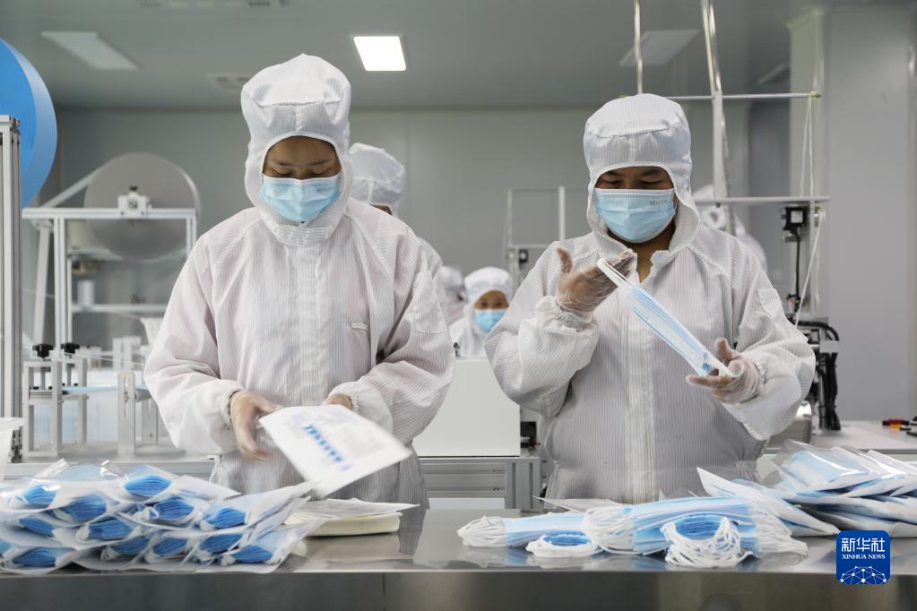 3月26日,在甘肅省臨夏市南龍鎮(zhèn)馬家莊村的甘肅陽(yáng)光智家網(wǎng)絡(luò)科技有限公司醫(yī)用口罩生產(chǎn)車間內(nèi),工作人員在加工生產(chǎn)醫(yī)用口罩。2021年初,該公司與另外一家材料科技企業(yè)聯(lián)合研發(fā)的石墨烯口罩實(shí)現(xiàn)批量生產(chǎn)。新華社記者 馬莎 攝