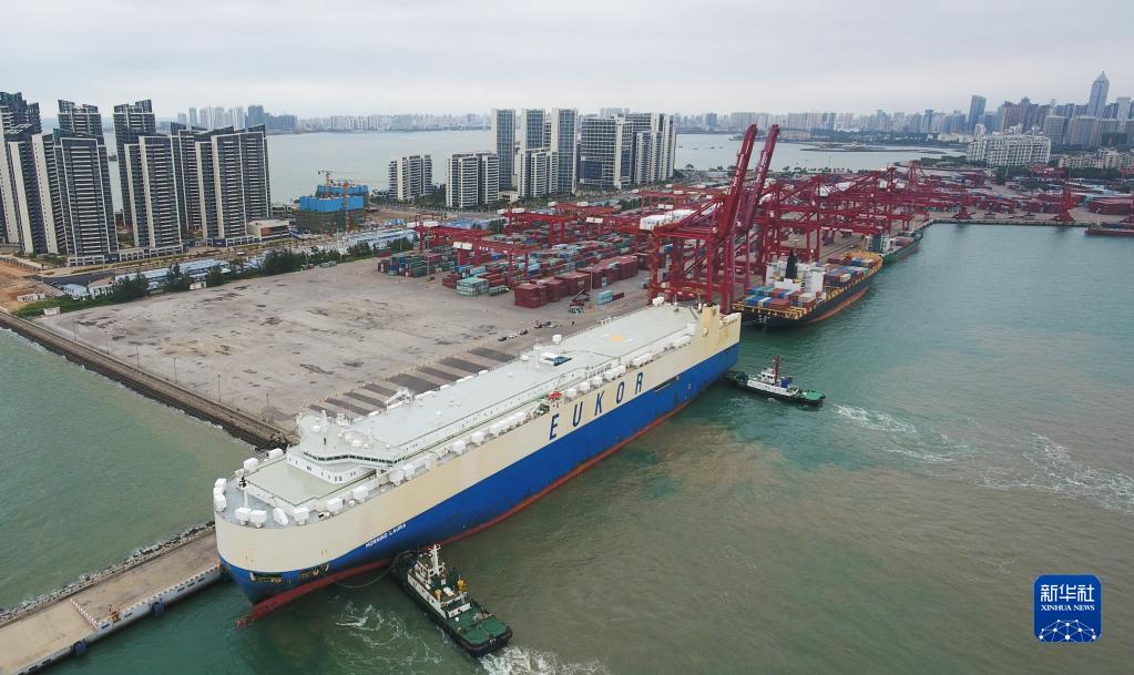 2020年2月16日,滾裝貨船“勞拉”輪駛?cè)牒?谛阌⒏郏o(wú)人機(jī)照片)。這是海南自貿(mào)區(qū)政策實(shí)施后的首艘汽車外貿(mào)船。新華社記者 楊冠宇 攝