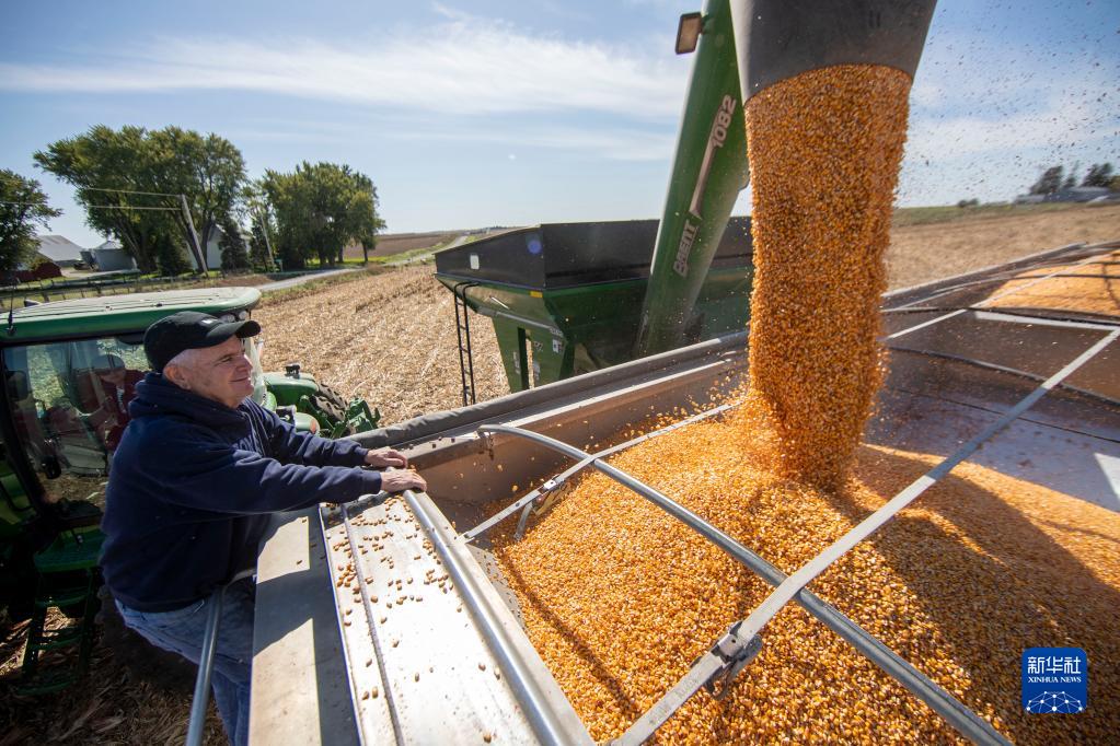 2019年10月14日,在美國(guó)艾奧瓦州大西洋鎮(zhèn),比爾·佩雷特看著收獲的玉米裝上卡車。新華社記者 王迎 攝