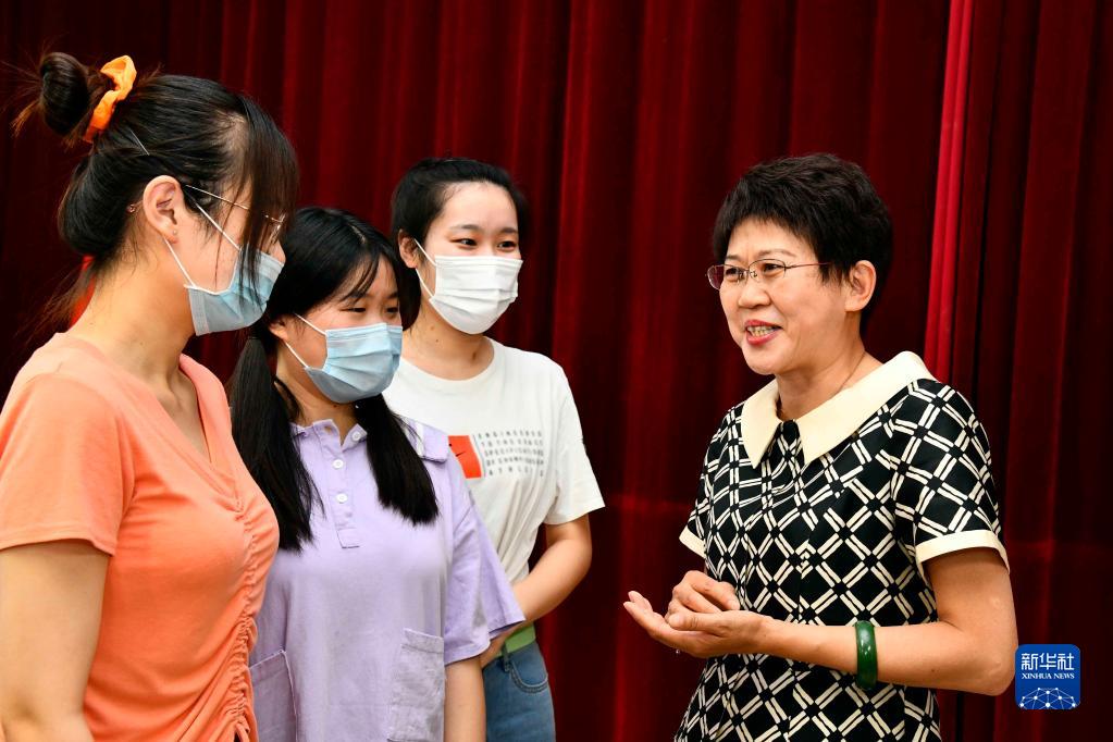 在山東濰坊學(xué)院法學(xué)院,全國人大代表高明芹(右一)在宣講民法典相關(guān)內(nèi)容(2020年6月16日攝)。新華社記者 郭緒雷 攝