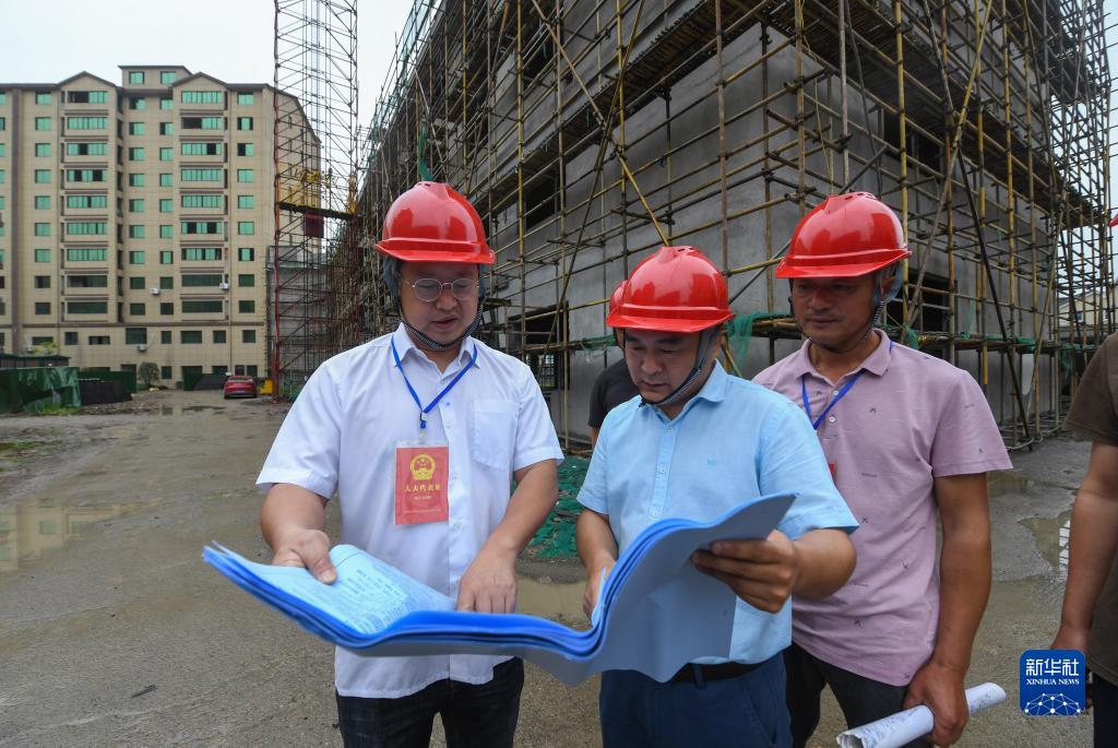2021年6月2日,在浙江省湖州市吳興區(qū)東林鎮(zhèn)星火村,當(dāng)?shù)厝舜蟠淼揉l(xiāng)村議事會成員對星火村農(nóng)民新村建設(shè)項目的施工進(jìn)展情況進(jìn)行監(jiān)督檢查。新華社記者 徐昱 攝