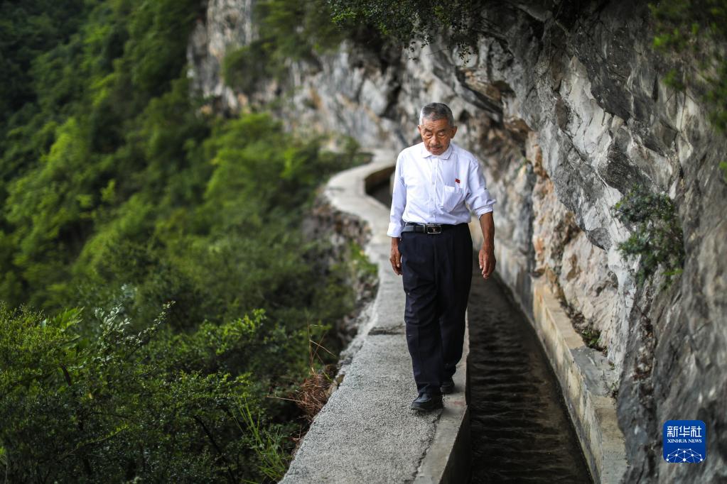 黃大發(fā)沿著修建在絕壁上的“大發(fā)渠”巡查(2018年8月11日攝)。新華社記者 劉續(xù) 攝