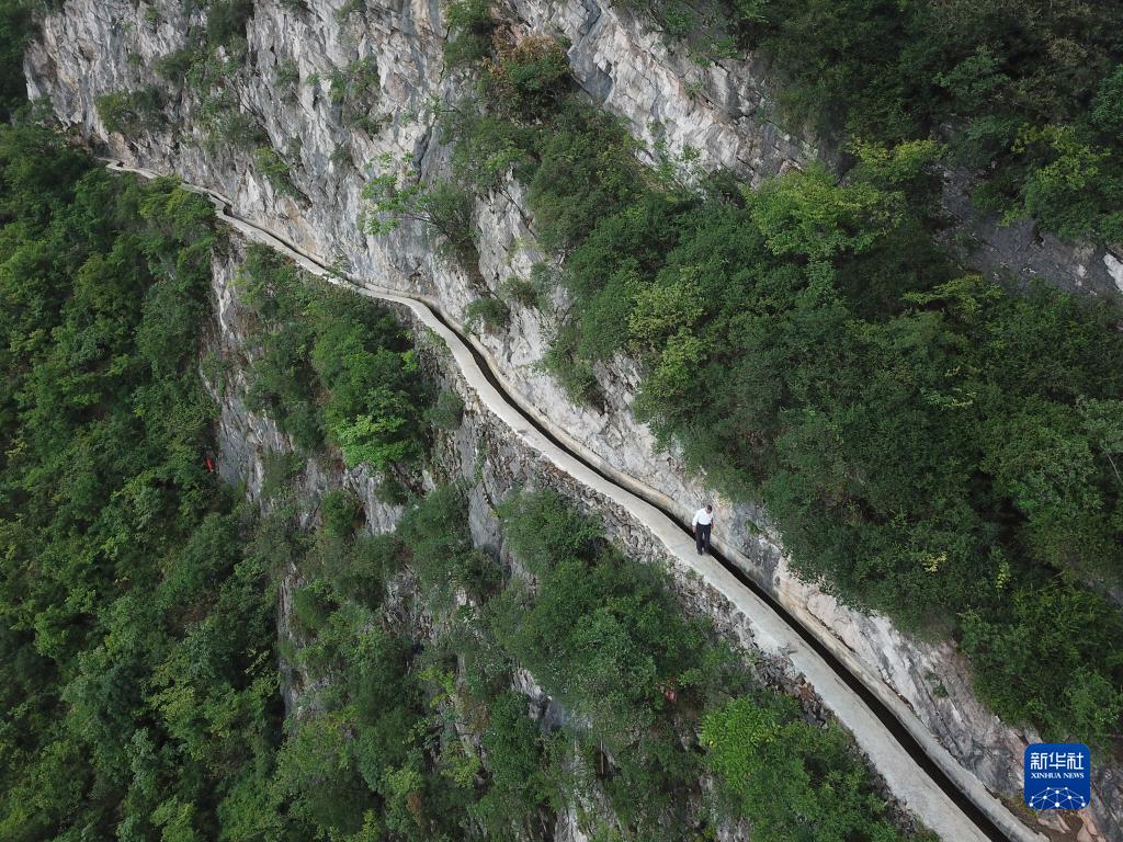黃大發(fā)沿著修建在絕壁上的“大發(fā)渠”巡查(2018年8月11日攝,無人機照片)。新華社記者 劉續(xù) 攝