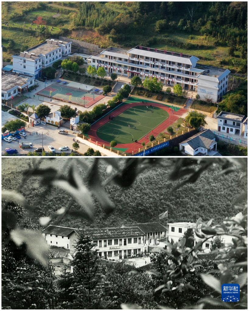 拼版照片:上圖為2019年11月5日拍攝的貴州省荔波縣瑤山民族小學新貌(無人機照片,新華社記者楊文斌攝);下圖為荔波縣瑤山民族小學舊貌(資料照片)。新華社發(fā)