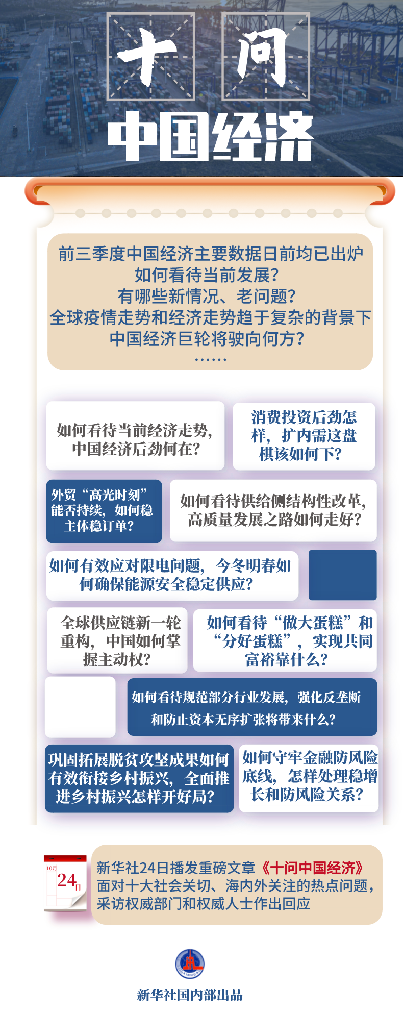 新華社24日播發(fā)重磅文章《十問中國經(jīng)濟(jì)》,面對十大社會關(guān)切、海內(nèi)外關(guān)注的熱點問題,采訪權(quán)威部門和權(quán)威人士作出回應(yīng)。