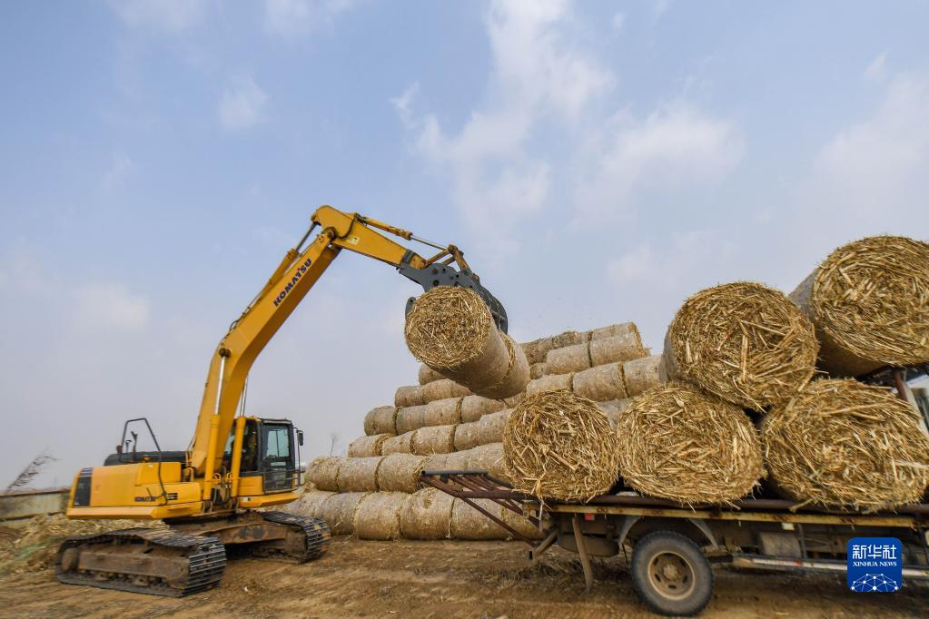 2020年11月12日,在吉林省四平市福港秸稈收儲有限公司,農(nóng)業(yè)機(jī)械搬運(yùn)打包好的秸稈。新華社記者 張楠 攝