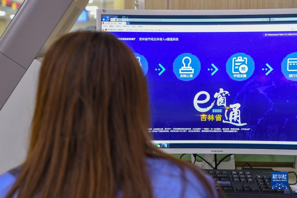 在吉林省四平市政務(wù)大廳,工作人員通過“e窗通”系統(tǒng)為企業(yè)負(fù)責(zé)人服務(wù)(2020年9月8日攝)。新華社記者 張楠 攝