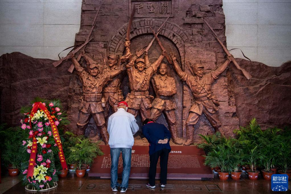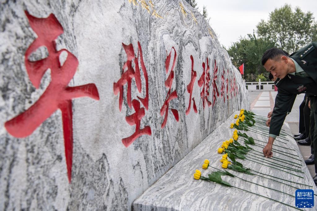2020年9月25日,在位于山西省大同市靈丘縣的平型關大捷紀念館,工作人員向革命先烈獻花。新華社記者 楊晨光 攝