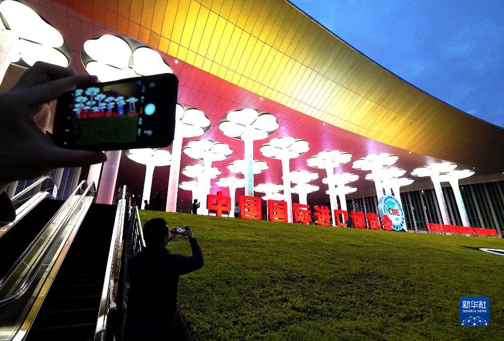 2018年11月4日,人們?cè)谂臄z國(guó)家會(huì)展中心(上海)場(chǎng)館夜景。2018年11月5日,首屆中國(guó)國(guó)際進(jìn)口博覽會(huì)在上海開(kāi)幕。新華社記者 陳飛 攝