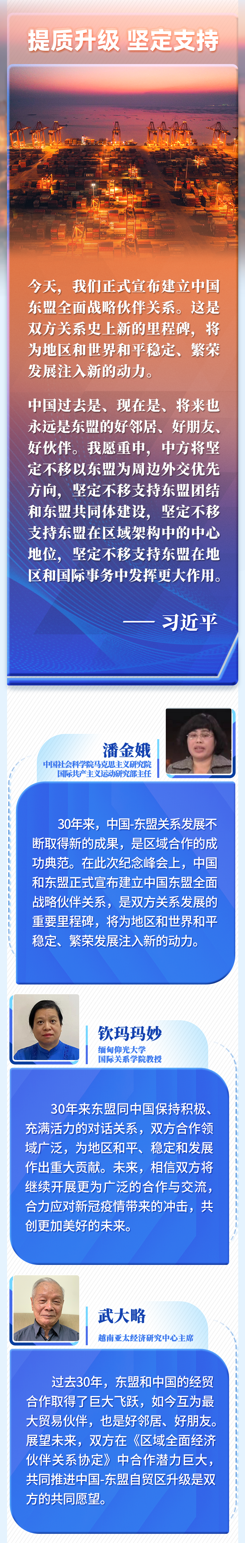 ? 國(guó)家主席習(xí)近平22日在北京以視頻方式出席并主持中國(guó)-東盟建立對(duì)話關(guān)系30周年紀(jì)念峰會(huì),發(fā)表重要講話。多國(guó)人士認(rèn)為,習(xí)近平主席的重要講話回顧30年來(lái)中國(guó)-東盟關(guān)系發(fā)展的重要成就和寶貴經(jīng)驗(yàn),為構(gòu)建更為緊密的中國(guó)-東盟命運(yùn)共同體擘畫(huà)藍(lán)圖,為共創(chuàng)更加繁榮美好的地區(qū)和世界注入新的強(qiáng)大動(dòng)力。