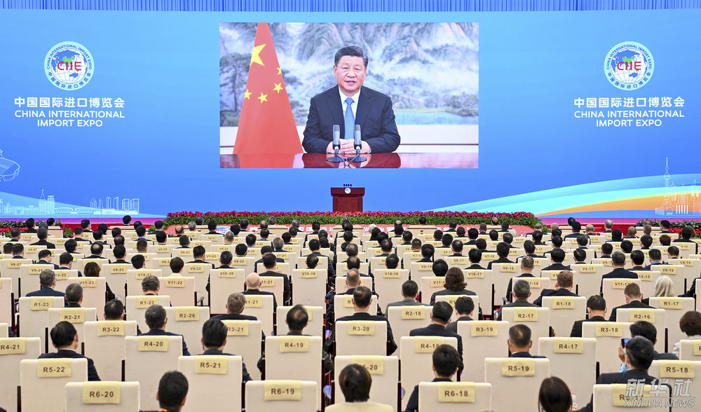 ↑2021年11月4日晚,習(xí)近平以視頻方式出席第四屆中國(guó)國(guó)際進(jìn)口博覽會(huì)開(kāi)幕式并發(fā)表題為《讓開(kāi)放的春風(fēng)溫暖世界》的主旨演講。