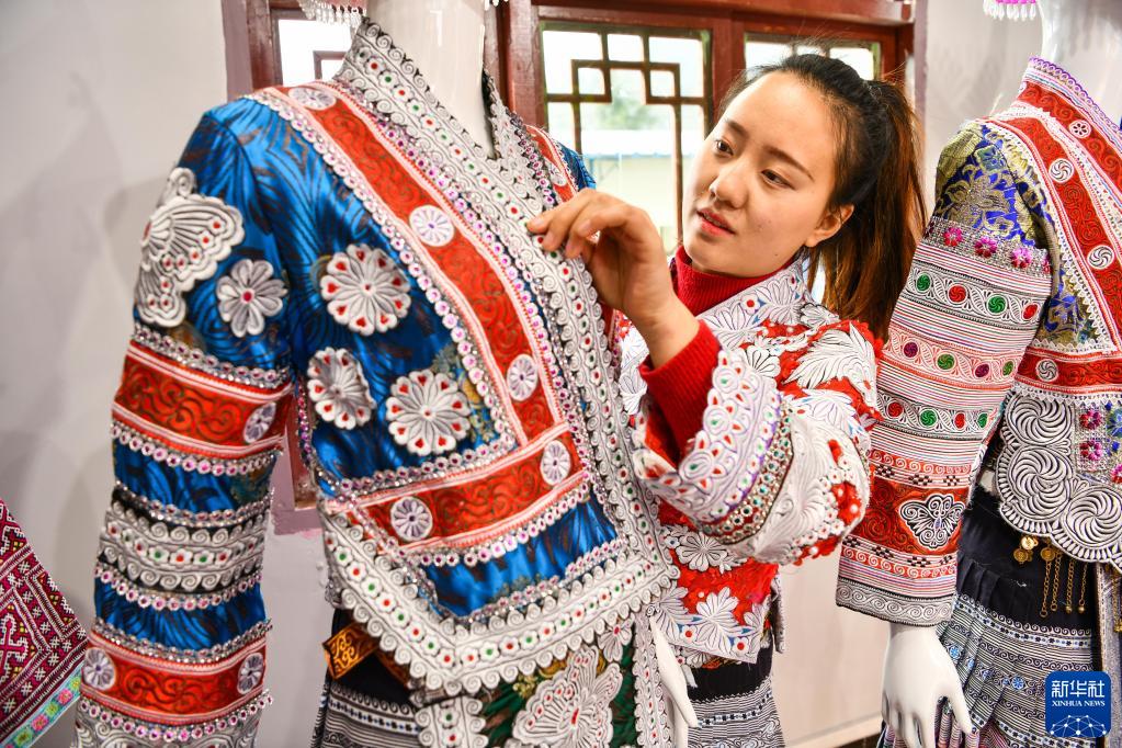 在貴州省畢節(jié)市黔西縣新仁苗族鄉(xiāng)化屋村麻窩寨易地扶貧搬遷集中安置點,苗族繡娘楊文麗整理苗族服飾(2021年2月20日攝)。新華社記者 楊文斌 攝