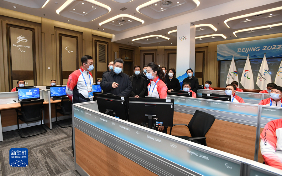 1月4日,中共中央總書記、國家主席、中央軍委主席習(xí)近平在北京考察2022年冬奧會、冬殘奧會籌辦備賽工作。這是4日下午,習(xí)近平在北京冬奧運(yùn)行指揮部調(diào)度中心考察。新華社記者 謝環(huán)馳 攝
