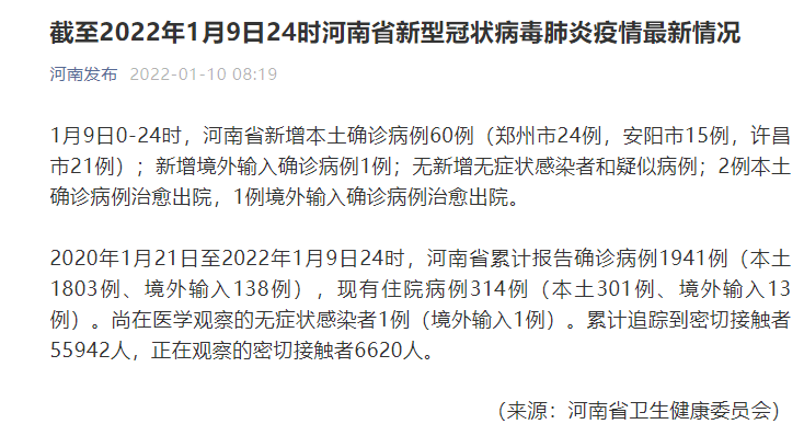1月9日0-24時(shí),河南省新增本土確診病例60例(鄭州市24例,安陽市15例,許昌市21例);新增境外輸入確診病例1例;無新增無癥狀感染者和疑似病例;2例本土確診病例治愈出院,1例境外輸入確診病例治愈出院。