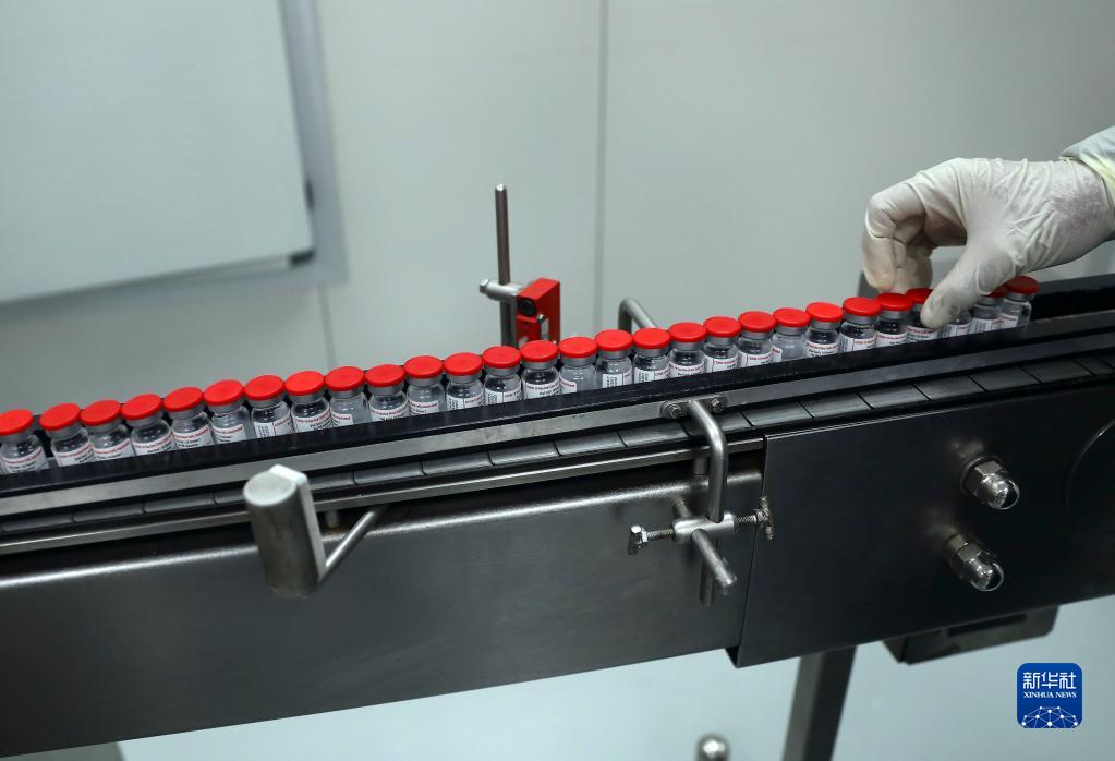 2021年10月5日,在馬來西亞吉隆坡郊區(qū)的發(fā)馬公司灌裝工廠,工人包裝本地灌裝生產的中國科興新冠疫苗。新華社記者 朱煒 攝