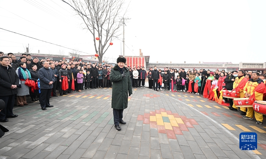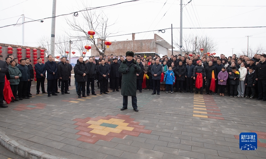 村文化廣場上十分熱鬧,村民們打起威風(fēng)鑼鼓、扭起秧歌歡慶佳節(jié)??吹娇倳泚砹?,人們高興地歡呼起來。習(xí)近平對鄉(xiāng)親們說,我們黨的根本宗旨就是為人民群眾辦好事,為人民群眾幸福生活拼搏、奉獻、服務(wù)。我們?nèi)缙诖蜈A了脫貧攻堅戰(zhàn),如期實現(xiàn)了全面建成小康社會目標(biāo),現(xiàn)在踏上了全面建設(shè)社會主義現(xiàn)代化國家新征程。建設(shè)現(xiàn)代化國家離不開農(nóng)業(yè)農(nóng)村現(xiàn)代化,要繼續(xù)鞏固脫貧攻堅成果,扎實推進鄉(xiāng)村振興,讓群眾生活更上一層樓,在推進農(nóng)業(yè)農(nóng)村現(xiàn)代化中越走越有奔頭。