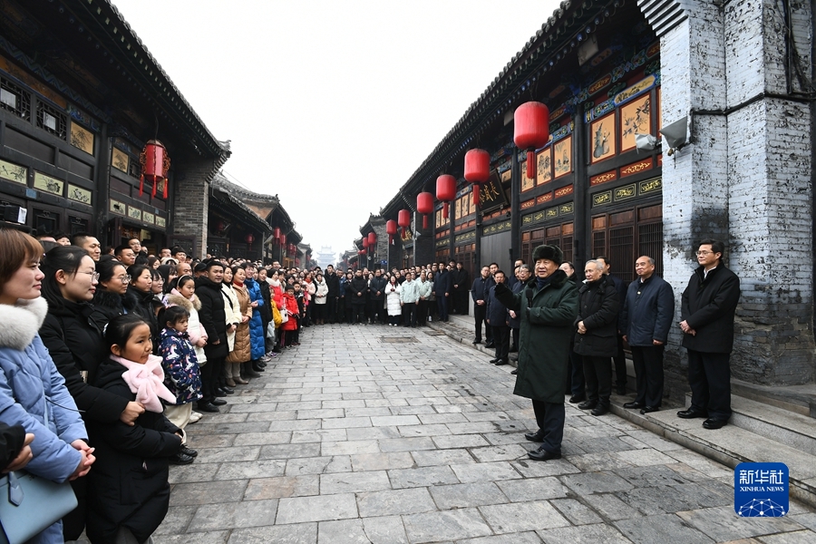 古城南大街年味濃郁。習(xí)近平沿街巷察看古城風(fēng)貌,走進平遙牛肉店、推光漆器店、東湖老醋坊,了解當(dāng)?shù)匚幕z產(chǎn)保護利用和開展特色經(jīng)營情況,并購買了平遙牛肉、餃子醋等年貨,還參與了陳醋發(fā)酵打耙。他指出,要做優(yōu)秀傳統(tǒng)文化傳承者,保護好推光漆器等文化瑰寶,把富有民族特色的傳統(tǒng)文化產(chǎn)業(yè)發(fā)揚光大、推向世界。現(xiàn)場群眾紛紛向總書記問好,習(xí)近平向大家揮手致意,給大家拜年。