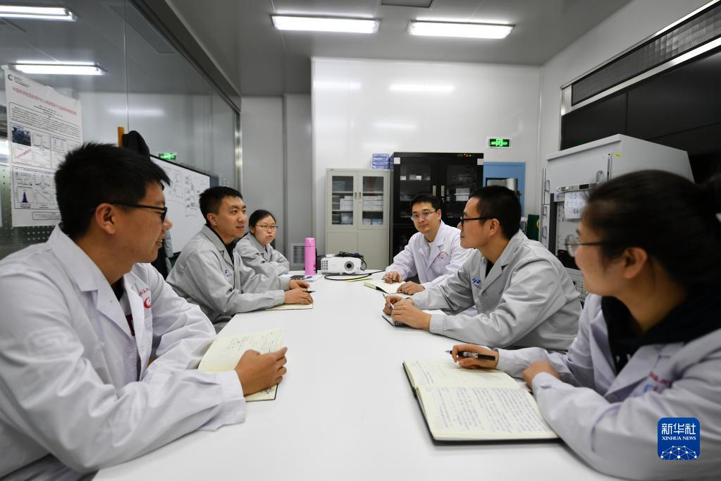 2月7日,科研人員在中國科學(xué)院國家授時中心空間鍶原子光鐘實驗室討論項目進度。新華社記者 張博文 攝