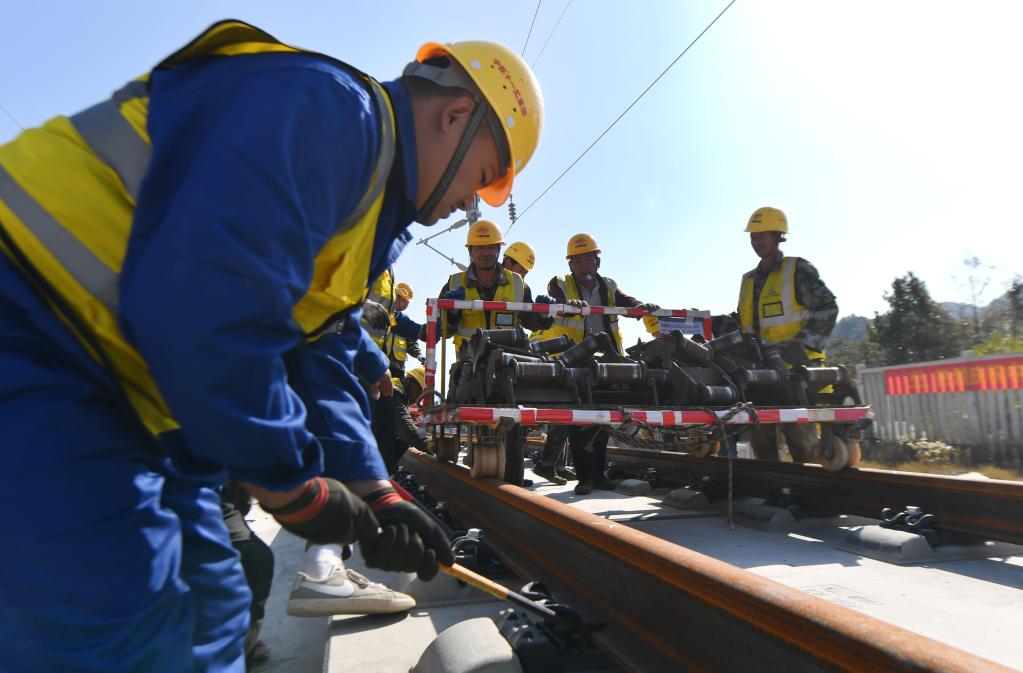 2021年12月1日,施工人員在常益長高鐵黃橋大道特大橋鋪軌現(xiàn)場(chǎng)施工。新華社記者 趙眾志 攝
