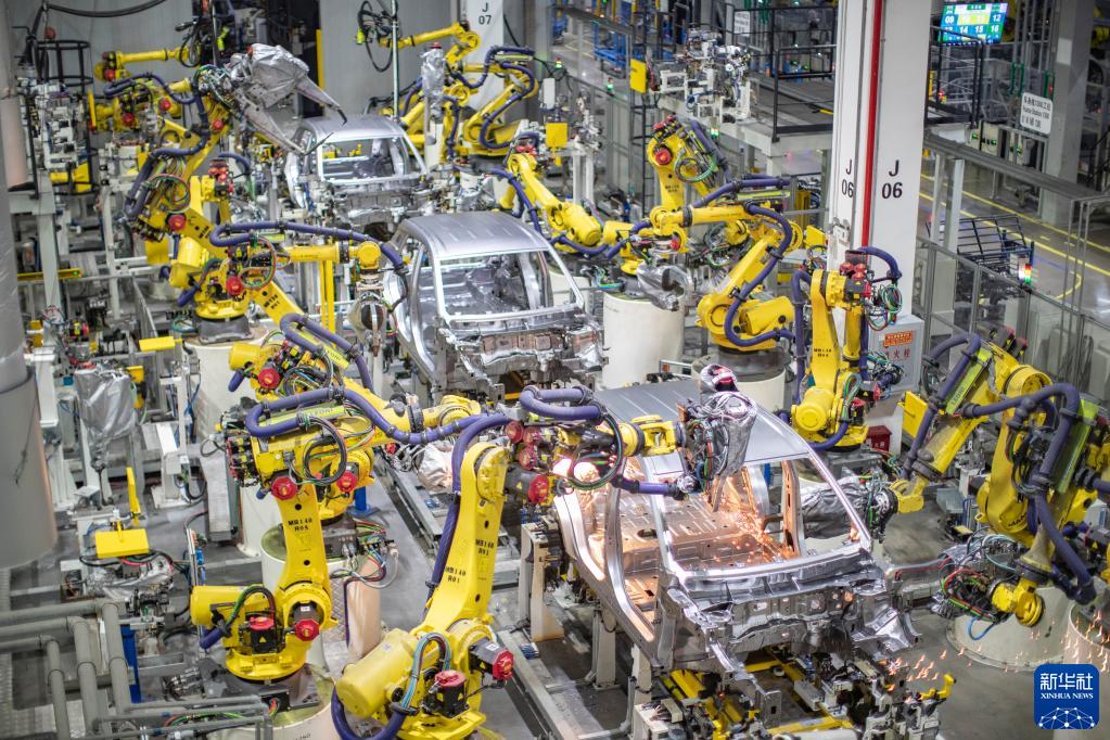 重慶一家新能源汽車企業(yè)使用智能化焊接機(jī)器人進(jìn)行焊接作業(yè)(2021年4月2日攝)。新華社記者 黃偉 攝