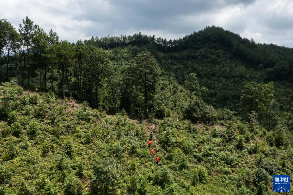 在浙江省杭州市臨安區(qū)太湖源鎮(zhèn)上陽(yáng)村重陽(yáng)塢,志愿者在“碳中和林”進(jìn)行日常巡查(2021年7月20日攝,無(wú)人機(jī)照片)。新華社記者 徐昱 攝